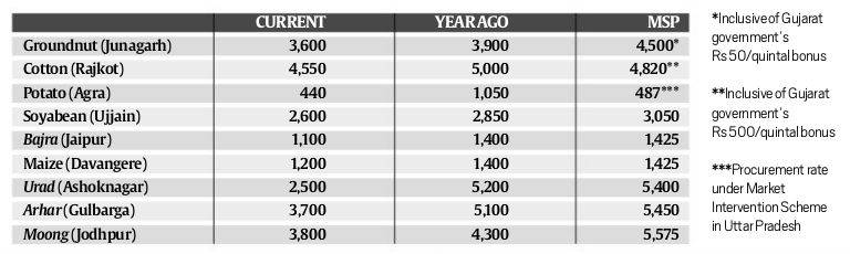 True, we have crops like paddy and wheat that have escaped price declines, mainly because of assured MSP-based procurement by government agencies. One can similarly point to onions and tomatoes; their respective ruling average prices of Rs 2,950 per quintal at Lasalgaon (Maharashtra) and Rs 2,034 per quintal at Kolar (Karnataka) are way above the Rs 950 and Rs 367 levels fetched during this time last year.