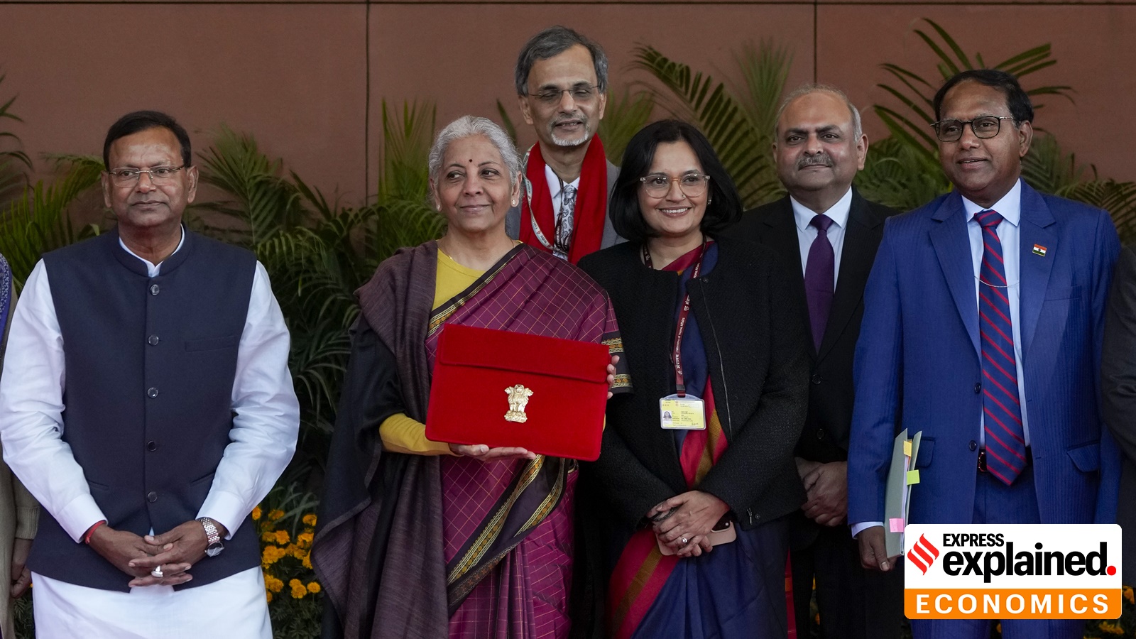 Union Budget 2026-27 explained: Finance Minister Nirmala Sitharaman shows the digital tablet, enclosed in a traditional red 'bahi-khata' style pouch, outside the Ministry of Finance before the presentation of the Union Budget. (Photo: PTI)