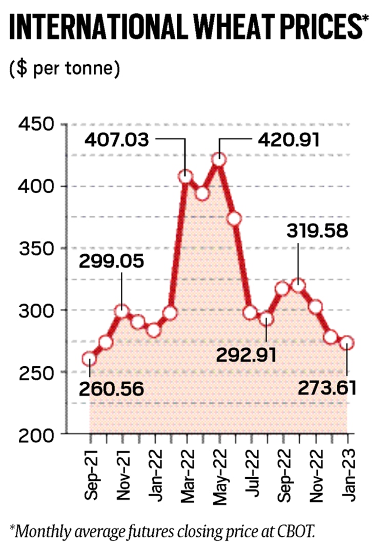 The first is the more-than-adequate public stocks of rice to meet the public distribution system’s requirements, before the new wheat crop arrives from April. The second is international wheat prices, which have eased considerably from their March-May highs immediately after Russia’s invasion of Ukraine. Prices at the Chicago Board of Trade futures exchange are ruling at their lowest since September-October 2021. (See chart)