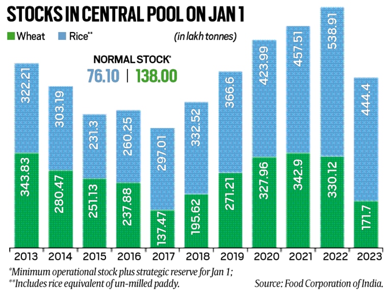 Farmers have sown wheat on 341.13 lakh hectares (lh) this time, as against 339.87 lh in 2021-22, and a normal area of 304.47 lh. That should ordinarily translate into bumper production — required particularly in the context of annual retail cereal inflation hitting 13.79% in December and wheat stocks in government warehouses on January 1 at a six-year-low. (See chart)