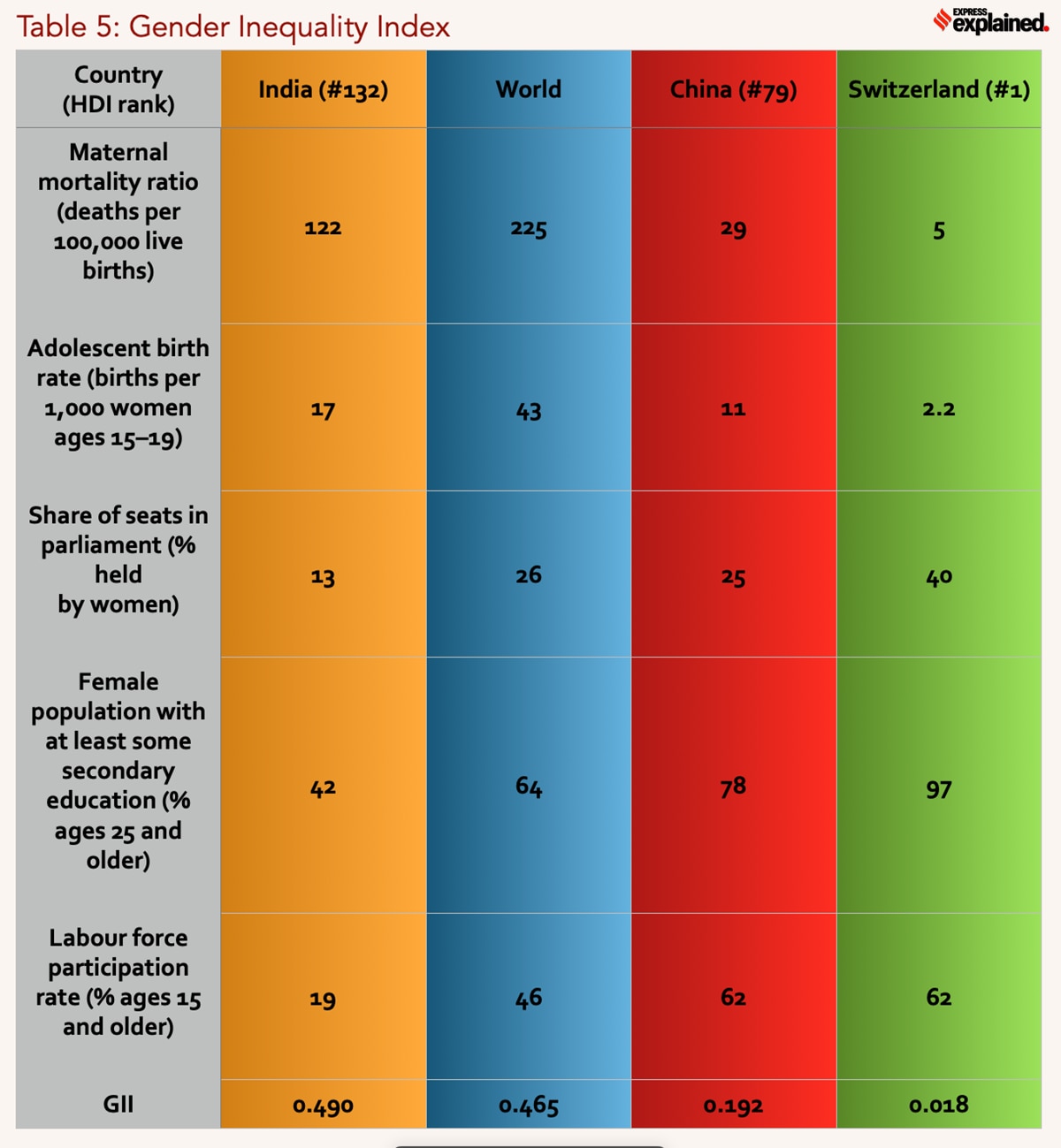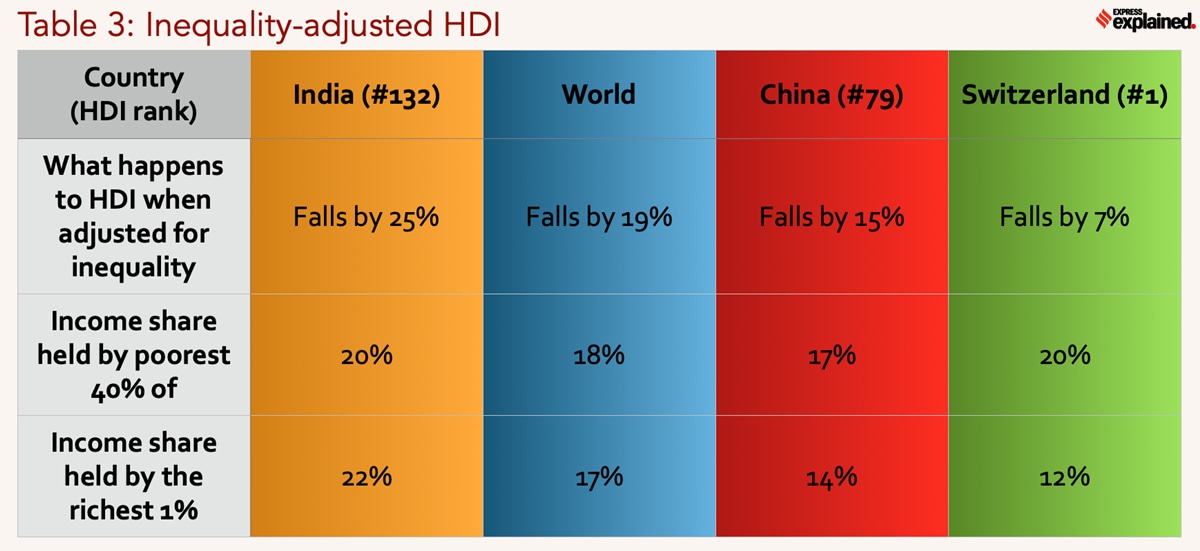 India’s HDI falls by 25% — the most among the countries mentioned in the Table — when adjusted for inequality. That’s because the share of income held by the richest 1% of the population is more than the income held by the poorest 40%. Neither China nor Switzerland are as unequal.