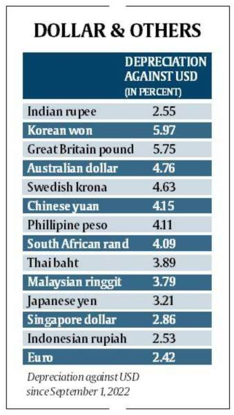As mentioned above, the rupee by contrast declined comparatively less — 2.6%. This was comparable to the decline in the euro, which lost 2.4% in September.