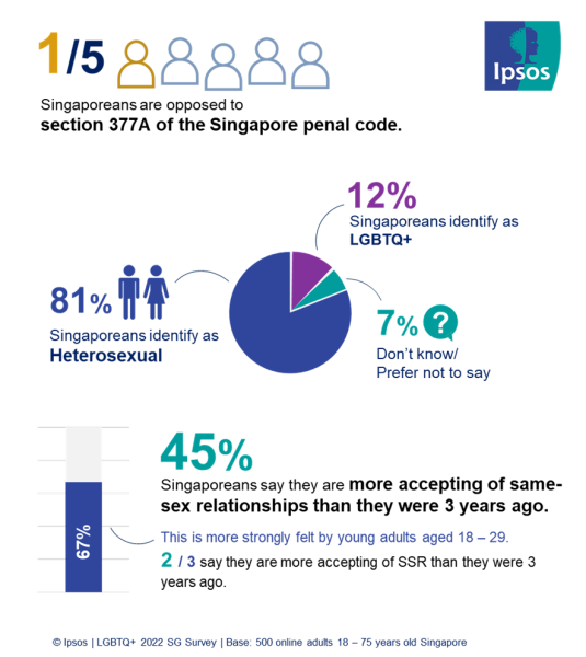 According to an Ipsos report from June this year, an “increased opposition towards Section 377A, support for same-sex parents and a willingness to speak up against unfairness towards the LGBTQ community point to a growing acceptance of same-sex relationships among Singaporeans.”