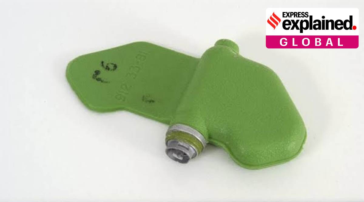 The PFM series mines are moulded in polythene plastic and have two wings, one of which is heavier than the other. The thicker wing is the pressure activation for the main fuse which is contained in the central body. The thinner wing acts as a stabiliser for the mine when it is air-dropped, thus giving it the name ‘butterfly’. As per data available on the mine, a pressure exceeding 5 kg will activate the mine which contains 40g of explosive.