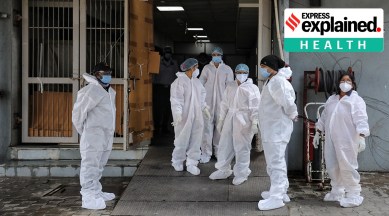Healthcare staff wait to receive patients at the entrance of Covid-19 ward at Civil hospital, Asarwa in July 2021. (Express Photo: Nirmal Harindran, File)