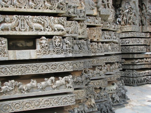 Some of the carvings at the Hoysaleswara temple in Halebidu. (Express photo: Monojt Majumdar)