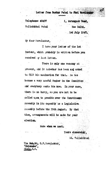 Sardar wrote: “Dr Ambedkar’s election requires earlier action, and as there is only one vacancy for the present, we have asked him to send his form today. He has not been elected from Bengal, and all people here feel that his attitude has changed and he has been a useful member in the Committee. In another vacancy which is going to occur after a short time, we will arrange for your election. In my case, you are not wanted in the Constituent Assembly before August 15th”.