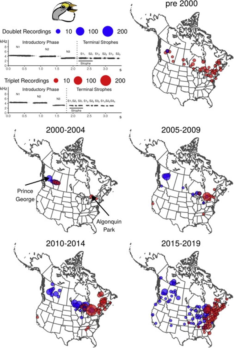 Essentially, from recordings that were collected over two decades across North-America, the researchers note that the novel doublet-ending song that originated in western Canada, has now spread at a continental scale. In 2004, when researchers recorded birds across Alberta, they found that half of the sampled males were singing the traditional triplet-ending songs. Within the next 10 years, they found that all the males in the area had switched to the new doublet-ending song.
