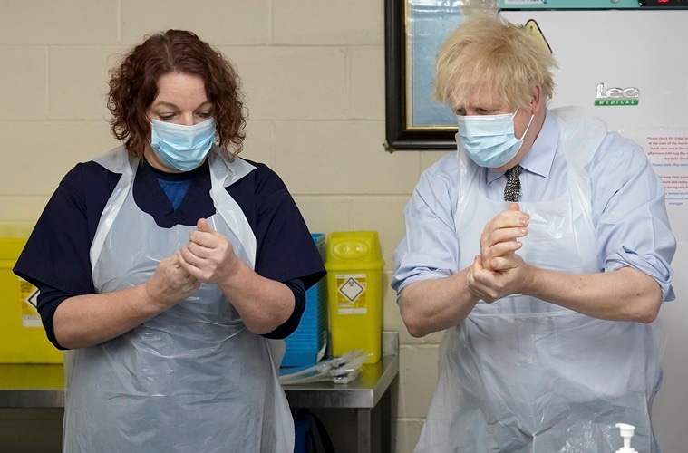 Britain’s Prime Minister Boris Johnson is shown how to prepare the vaccine by advance nurse practitioner Sarah Sowden as he visits a COVID-19 vaccination centre at the Indian Muslim Welfare Society (IMWS) Al-Hikmah-Centre in Batley, West Yorkshire, England, Monday, Feb. 1, 2021. (AP Photo/Jon Super, pool)