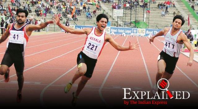 Arunjith (centre) from Kerala rejoices after he wins the men’s 100 metre sprint during the 33rd National Games at Indira Gandhi Athletic Stadium in Kerala in February 2017. (Express Photo: Subhamoy Bhattacharjee)