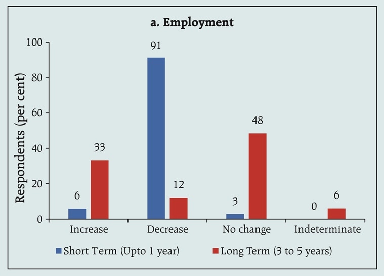 As regards the immediate impact (see blue-coloured bars) of the second Covid wave on the economy, an overwhelmingly large percentage of respondents expected employment, productivity, and wages to decline, even as they expected prices to rise. (See charts below)