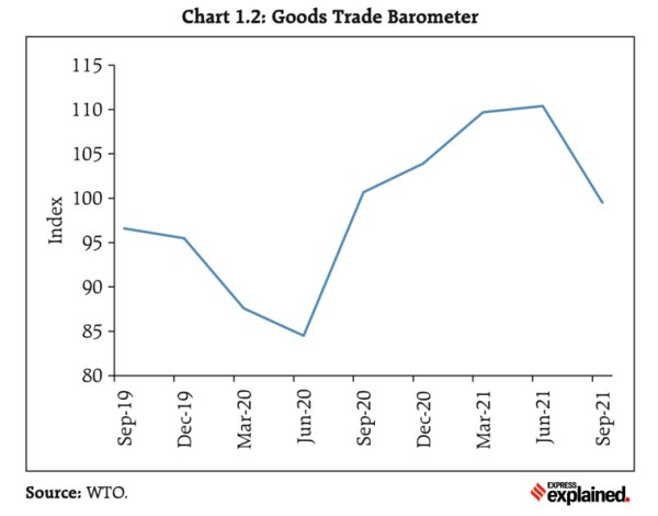 For instance, the Goods Trade Barometer (see CHART 1) of the World Trade Organization (WTO) shows that the World merchandise trade volumes, which had risen 22.4 per cent year-on-year in Q2 (April to June) of the 2021 calendar year, have been slowing in the second half of the year. “The decline in the barometer reflects a combination of tapering import demand and disrupted production and supply of widely traded goods such as automobiles and semiconductors,” states the FSR.