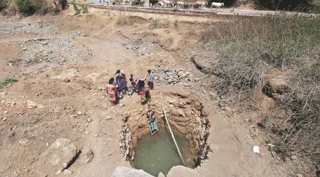 Villagers draw water from a shallow well in a tribal area of Navsari in south Gujarat. (Express photo by Javed Raja)