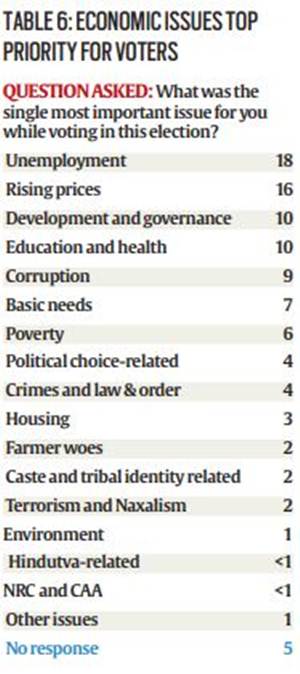 While all-India narratives did not work, problems faced by voters of Jharkhand might still be the same as those faced by citizens elsewhere. The data emerging from the CSDS-Lokniti Post-Poll Survey in Jharkhand endorse the critical role of local factors and developments in explaining the electoral outcomes in the state. More than four of every ten respondents (43%) in the Jharkhand post-poll survey indicated that economic issues were the most important factor that influenced their voting choice (Table 6). The state government had to bear the brunt of popular dissatisfaction on this account.