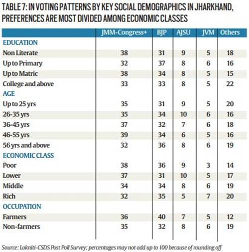 With almost no community barring the OBCs feeling that the state government did indeed take care of its interests, the JMM-Congress-RJD coalition managed to forge a winning combination of different segments of the society. Thus, in explaining how the BJP lost Jharkhand, it may be useful to look at a few key demographic variations in support for the JMM-led alliance and the BJP (Table 7).