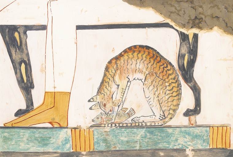 Copy of wall painting from private tomb 52 of Nakht, Thebes (I, 1, 99-102); cat eating fish. © Ashmolean Museum, University of Oxford