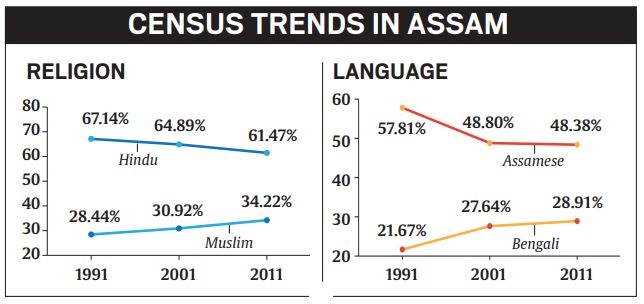 In Census of India data, the Assamese-speaking population fell from 57.81% in 1991 to 48.38% in 2011, while the Bengali-speaking population rose from 21.67% to 28.91% in the same period. Simultaneously, the Hindu population declined from 67.14% to 61.47%, while the Muslim share grew from 28.44% to 34.22%.