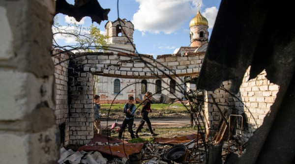 Local boys play in front of a church damaged during Russia’s invasion of Ukraine, in the village of Kolychivka, in Chernihiv region, Ukraine April 27, 2022. (Reuters)