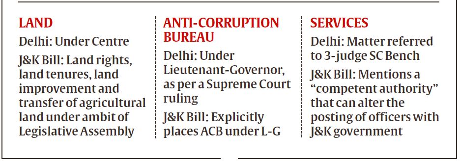J&K will be the third Union Territory after Delhi and Puducherry to have an elected Assembly. How does its govt’s powers, as described in the Reorganisation Bill passed by Parliament, compare with Delhi’s?