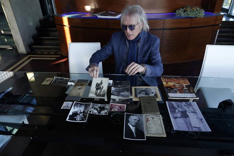 Jed Leiber, one of the plaintiffs, shows photos of his grandfather Saemy Rosenberg’s life at home Thursday, Dec. 3, 2020, in Los Angeles. (AP Photo/Marcio Jose Sanchez)