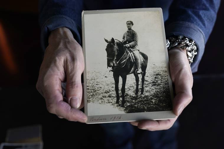 Jed Leiber shows a photo of his grandfather Saemy Rosenberg as a cavalry officer with the German army during WWI at home Thursday, Dec. 3, 2020, in Los Angeles. (AP Photo/Marcio Jose Sanchez)