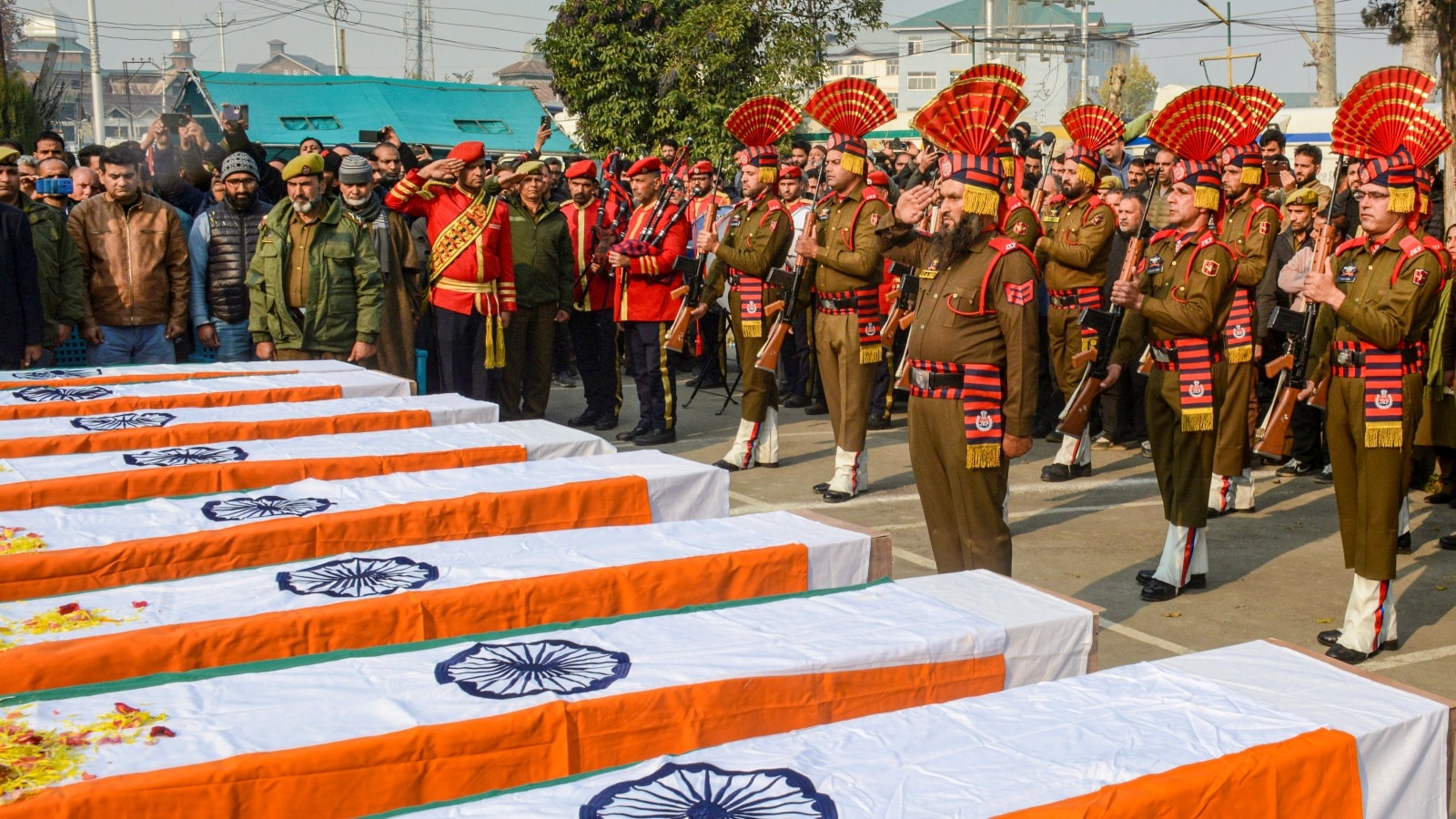 Security personnel pay tribute to the victims who were killed in an accidental explosion which ripped through Nowgam police station late Friday night, in Srinagar, Saturday, Nov. 15, 2025. At least nine people were killed and 32 others suffered injuries in the incident, according to officials. (PTI Photo)