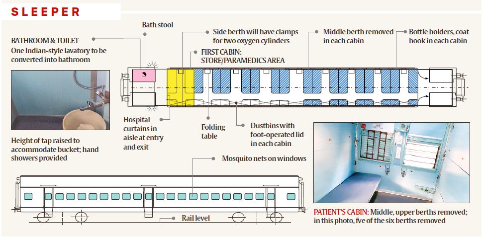 Several ideas were discussed, including erecting shamianas over the coaches, or painting the roof with “solar reflective” paints. Finally, it was decided the roof would be insulated in a number of coaches. The technical solution was vetted by the Research Designs and Standards Organisation of Railways. A solution has been developed by IIT Mumbai which brings down the temperature in the coach by several degrees. Railways has attached an AC coach as well, for doctors and medical staff.
