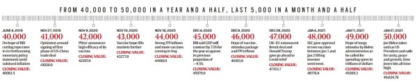 The latest spike that has pushed the Sensex past 50,000 is primarily on account of the smooth transition of power in the United States after the deadly January 6 siege of the Capitol. As President Joe Biden offered hope – promising to take all Americans along and hinting at improving relations with the rest of the world – market sentiments were lifted. Biden’s proposed $1.9 trillion stimulus is likely to keep global markets at elevated levels for now.