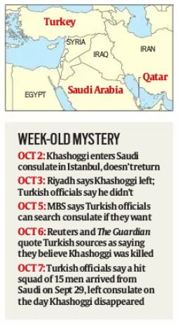 A week ago, Saudi Arabian Jamal Khashoggi — a resident of the US and a columnist for The Washington Post — visited the Saudi consulate in Istanbul to pick up a document he needed under Turkish law to marry his fiancee, a Turkish woman. He did not emerge, and over the next few days, unnamed Turkish officials were quoted in news reports as saying they believed Khashoggi was murdered by a Saudi hit squad inside the consulate building, and his body was taken out in a black car. But they did not explain how they had reached this conclusion — equally, Riyadh, even though it insisted the charges were baseless, did not give any explanation for Khashoggi’s disappearance. Istanbul police have opened an investigation, and President Recep Tayyip Erdogan has said he will wait for its findings.
