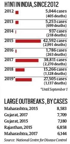 Until September 1, the year 2019 has had over 27,505 reported cases of H1N1 (swine flu) in India, with 1,137 deaths.