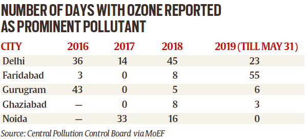 During the last three calendar years, ozone was reported as a prominent pollutant for 95 days in Delhi and 11, 48, 8 and 49 days in Faridabad, Gurugram, Ghaziabad and Noida respectively, the government said in Lok Sabha during the current session of Parliament. These numbers were based on the Air Quality Index of the Central Pollution Control Board. Replying to a question on ozone levels in Delhi-NCR, Environment and Forest Minister Prakash Javadekar tabled AQI figures on ozone status for 2016, 2017 and 2018 as well as for the first five months of 2019. The figures showed that until May 31, Delhi has already had 23 days with ozone levels over the prescribed limit, while Faridabad has had 55.
