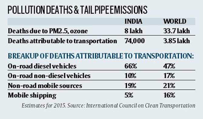 Air pollution from transportation sources caused an estimated 74,000 deaths in India in 2015, out of which two-thirds (66%) could be attributed to tailpipe emissions from diesel vehicles on the road, according to estimates in a global report by researchers from the International Council on Clean Transportation (ICCT), George Washington University, and University of Colorado Boulder.