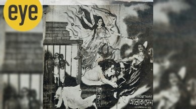 Long before Unesco was thinking of Durga Puja as part of humanity’s “intangible cultural heritage”, Niladri Chatterjee was collecting very tangible artefacts of Durga Pujas past. He has a black-and-white glossy print from 1979 of a Durga image from Tarun Sporting Club — a fairly traditional Goddess on a rearing lion, spearing Mahisasura while emaciated men in dhotis look on from behind bars. At the corner is the artist’s name — Aloke Sen.