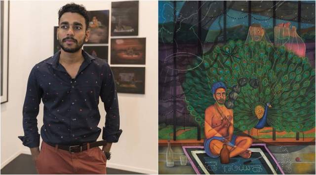 Back in 2005, when he was a student at the Government College of Fine Arts in Thrissur, Kerala, Abul Hisham would, every day after class, make his way to the heart of the city — the circular road, Swaraj Round, circling around the hillock known as the Thekkinkadu Maidan. On it stood the imposing Vadakkunnathan Temple. This is the place from where the city radiates outwards, and this is where — whether you’re a tourist or an artist or simply someone with lots of time on your hands — you go to observe how the ordinary citizens of Thrissur live their lives. For someone like Hisham, drawn early to the half-told and half-seen dramas of human lives, there was no better place from which to draw inspiration. “I would go there with my classmates and find these various figures — a group of friends playing cards, a lottery-ticket seller — and make images of them. That was when I started paying attention to the little details,” he says. Capturing the gestures, expressions and postures of these figures in his sketches was early practice for what would eventually emerge as Hisham’s main artistic preoccupation — storytelling. It is a preoccupation that is fully on display in the 30-year-old's latest solo, “Recitation”, at Galerie Mirchandani + Steinruecke in Mumbai, featuring eight large works that hint at stories waiting to be told. There's the group of bathers, their faces frozen in a rictus of terror, as they are watched by a group of wolves in the suggestively named Hidden Obstacles (19th Trap). What are these people so scared of? The wolves, with their gleaming eyes and slavering jaws, or something else? That these bathers, some of whom are captured in postures of piety, are covered in jewels, seems to hint at something far more subtle than the fear of being mauled by wild animals. Then there’s the figure in This or That (Stalker’s Stories), who has been portrayed with his legs folded in a yogic posture. But that's just the lower half of him, as his torso is covered in what looks like part of an armour. Intriguingly, his eyes seem to be rolling back in something like ecstasy whereas his hands clasp his knees in a contemplative attitude. Are we in that part of the story where we see a man, keen to immerse himself in contemplation, battle with his other impulses? Or, given the other elements at work in the painting, are we in a different story altogether? Hisham’s journey as an artist right from his childhood. His father ran an art materials shop in Thrissur, besides being an artist himself. Hisham decided early that this was the path that he would take as well, and, after finishing school, he joined the Government College of Fine Arts to pursue Bachelor’s of Fine Arts in painting. “Originally, I went to college with the idea that I would pursue a career in animation or some form of applied arts, but I soon realised that design was not for me, and that I was more inclined towards painting,“ he says. It also helped that college opened up all sorts of intellectual possibilities. “Thrissur is the cultural capital of Kerala and I was introduced to so many ideas through theatre, music, films. I realised that I could express everything I was learning from these in my painting,” he says. He then went to the SN School of Arts in Hyderabad in 2010 for Master’s of Fine Arts in painting, and was based there until last year, when he moved back to Thrissur. His first two solos, “Domination” (2010) at Kashi Art Gallery in Kochi and “Abul Hisham — New Works” (2014) at Galerie Mirchandani + Steinruecke, showed a deft adaptation of influences from art history, cinema and pop culture into works of startling originality. The new works have a more shadowy feel, with a greater interplay of ambiguity and specificity. Indeed, it is this very quality that makes them seem like folios salvaged from a long-lost album of paintings. Looking at them, it feels like one has stumbled into the middle part of a story already being told. In fact, one of the influences that has shaped Hisham’s artistic expression are the albums created by painters for the Mughal emperors. “I love the idea of albums of Mughal miniatures, which tell a story, such as the Hamzanama. When I saw these, I asked myself why I couldn’t make something like this myself,” says the artist. His endeavour, however, is to capture the drama of the human mind, as it struggles with itself and the world outside. There’s something of a spiritual quest in these works, with hints scattered among the paraphernalia surrounding the figures in the works — incense sticks, prayer beads — and the recurrence of the Arabic words algharur (ego) and raghbat (desire). The artist, who draws on his own personal practice of contemplation for his work says, “The question that drives me now is how to depict the process of contemplation, the conflict between our need to observe our own selves and the need to interact with the world.”