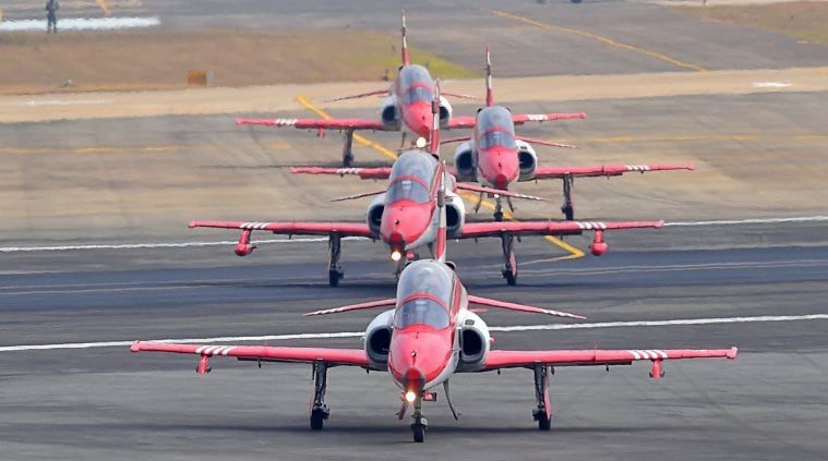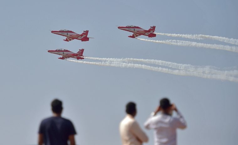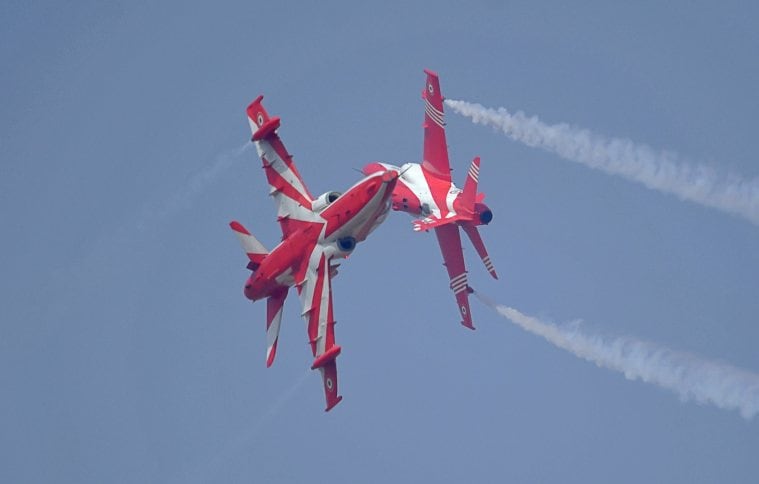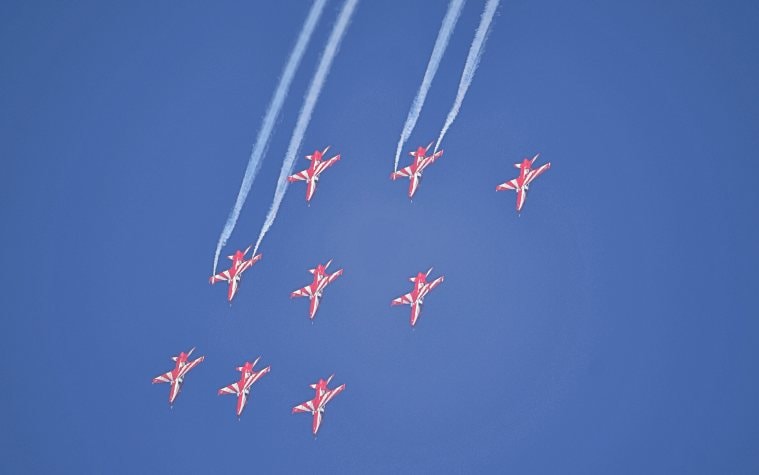 Indian Air Force (IAF)'s acrobatic team, 'Suryakiran', performs a sortie ahead of the AERO INDIA 2021 show at Yelahanka Air Base in Bengaluru. (PTI)India on Wednesday displayed its prowess in military aeronautics at the opening session of the 13th edition of the biennial Aero India-2021, inaugurated by Defence Minister Rajnath Singh at the Yelahanka Air Force Station, Bengaluru. While the indigenously developed Tejas-LCA helicopters and Surya Kiran aircraft stole the show, Sukhoi, Rafale, Hawk and the American B-1B Lancer heavy bomber were among the star attractions.