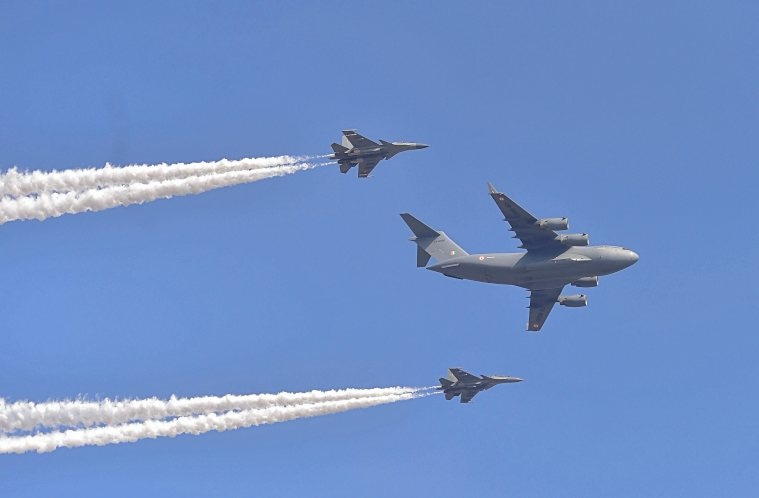 Indian Air Force’s C-17 Globemaster and two Su-30 jets fly past in a formation during rehearsals for the Aero India 2021, at the Yelahanka air base in Bengaluru. (PTI)