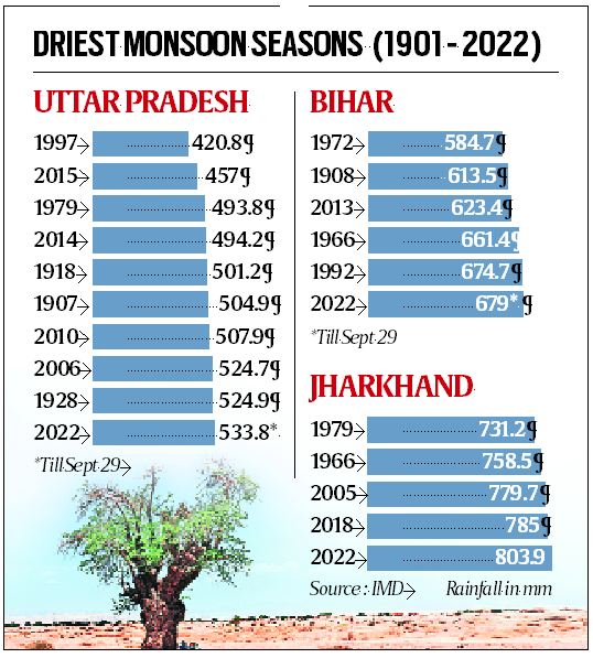 In Jharkhand, 16 out of 24 districts (64 per cent area) have had deficient rainfall this season, and the driest among them were Pakur (-60 per cent), Sahebganj (-58 per cent), Godda (-54 per cent), Garhwa (-44 per cent) and Jamtara (-46 per cent). The 2022 monsoon season will end as Jharkhand’s fifth worst in 122 years.