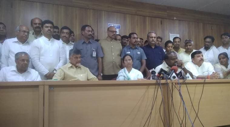 In an unprecedented move, four non-BJP Chief Ministers on Saturday threw weight behind their Delhi counterpart Arvind Kejriwal, who has been staging a sit-in at Lieutenant Governor (L-G) Anil Baijal's office since Monday evening. West Bengal CM Mamata Banerjee, Kerala CM Pinarayi Vijayan, Karnataka CM H D Kumaraswamy and Andhra Pradesh CM Chandrababu Naidu visited Kejriwal's residence to meet his family and held a press conference thereafter to extend their support to the Aam Aadmi Party (AAP) chief. While addressing reporters in the national capital, Banerjee termed the impasse as a "constitutional crisis" and sought Prime Minister Narendra Modi's intervention in the case. The four CM's had sought an appointment with the L-G but later learnt that Baijal was not in his office. "We were told that the LG is not at home. Our demand is very simple: Sort out the issue, let the elected government work," Naidu told reporters. Banerjee was earlier denied permission to meet her Delhi counterpart by the L-G. Reacting to the development, Kejriwal immediately trained his guns at Prime Minister Narendra Modi and accused him of “directing” the L-G to refuse the Trinamool Congress chief permission. He tweeted, “This is getting more and more bizarre…” He added, "I don’t think Hon’ble L-G can take such a decision on his own. Obviously, PMO has directed him to refuse permission. Just like IAS strike is being done at PMO’s instance." Kejriwal and his Cabinet colleagues are sitting at the office of Lt Governor Anil Baijal demanding his direction to the IAS officers to end their "strike" and approve doorstep ration delivery scheme, since last Monday.