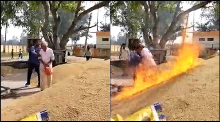 The video shows a man throwing kerosene onto the crop and setting it on fire, while some men try to stop him. (Twitter/Screengrab)