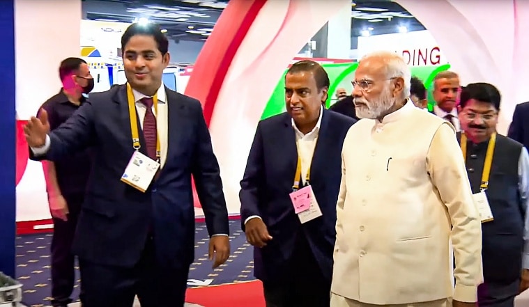 Prime Minister Narendra Modi with businessman Mukesh Ambani and his son Akash Ambani during the inauguration of the 6th India Mobile Congress at Pragati Maidan in New Delhi, Saturday, Oct 1, 2022. (PTI Photo)
