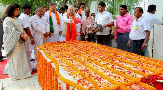 BJP president Amit Shah on Saturday offered prayers at Giroudpuri Dham, a popular pilgrimage site of Satnamis, a ST community, in Balodabazar district on the last day of his three-day visit to Chhattisgarh. He also visited Sonakhan village, the birth place of freedom fighter Shaheed Veer Narayan Singh in the same area. The BJP chief was accompanied by Chief Minister Raman Singh, party's state unit president Dharamlal Kaushik, other senior leaders of the party and state ministers. Giroudpuri, located around 130 kms from the state capital, is the birth place of Satnami saint and social reformer Guru Ghasidas Baba. A 253-ft-tall 'Jaitkham' has been erected at the pilgrim centre, which is touted as the highest concrete tower in the country. After arriving at Giroudpuri, Shah and other leaders offered prayers at the 'dham' and also met seers of Satnami community there. "The massive 'Jaitkham' built at the birthplace of Guru Ghasidas Baba is spreading the messages of truth, non-violence, and philanthropy," Shah said. His visit to the dalit community's biggest pilgrimage centre in the state is seen as the BJP's outreach to STs and SCs ahead of the next year's Assembly elections in the state. The BJP is trying to vow Scheduled Caste community voters who constitutes about 12 per cent of the state's total population of 2.5 crore. The community plays a crucial role in forming government in the state. However, SC voters, considered as the loyal vote bank of the Congress in the state, switched their loyalty to the BJP in the 2013 Assembly election. In the last assembly elections, BJP won nine out of ten SC reserved seats in the state, leaving just one for the Congress. Shah subsequently went to Sonakhan where he addressed a gathering of people. "The valorous land of Sonakhan is sacred for every patriot. I feel fortunate to have visited this place of Chhattisgarh, where freedom fighter Shaheed Veer Narayan Singh was born. Singh had made a tremendous contribution in the freedom struggle in year 1857. "His love for the country and compassion for poor people is inspiring for entire humanity," he said. On the occasion, the chief minister announced that a life-size bronze statue of the martyr will be erected in Sonakhan. Shah and other leaders also visited the 'samadhi' of Veer Narayan Singh and paid a floral tribute. During his three-day visit which began on June 8, Shah has interacted with MPs, MLAs, BJP office-bearers and booth representatives and has given them tips for strengthening the party ahead of the next year's Assembly polls and 2019 general elections. A controversy erupted on the penultimate day of his three-day visit on Friday when he called Mahatma Gandhi a "chatur baniya", a reference to his mercantile caste, while addressing a gathering of prominent persons in Raipur.