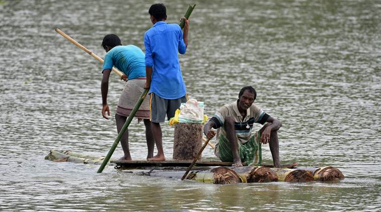 Villagers row on a makeshift raft as they try to move to safer places at a flooded village in Nagaon district, in the northeastern state of Assam, India August 16, 2017. (Source: REUTERS)