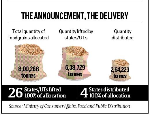 While 26 out of 36 states and Union Territories have lifted 100 per cent of foodgrains with respect to their allocations, only four — Bihar, Chhattisgarh, Nagaland and Odisha — have reported 100 per cent distribution of foodgrains among the beneficiaries.
