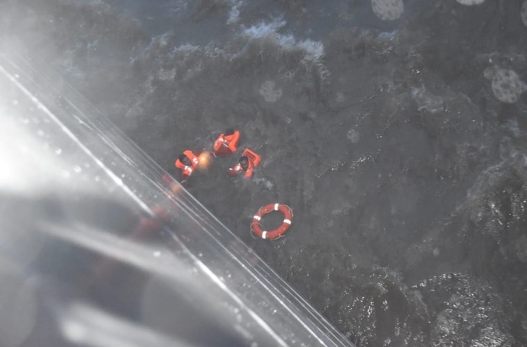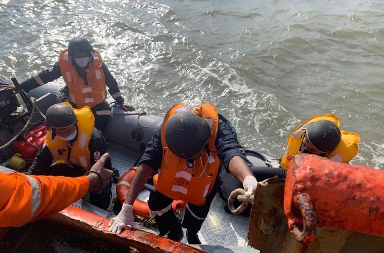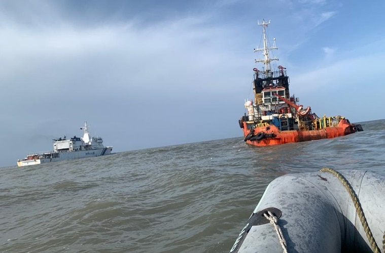 Rescue operations underway after ONGC vessels went adrift off the Mumbai coast. (Express Photo)