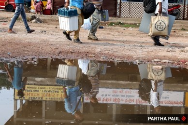 Election officials carrying EVM machines on their way to their booth from Cooch Behar Polytechnic DC ,RC & counting Centre in Cooch Behar on April 09,2021.Express photo by Partha Paul.