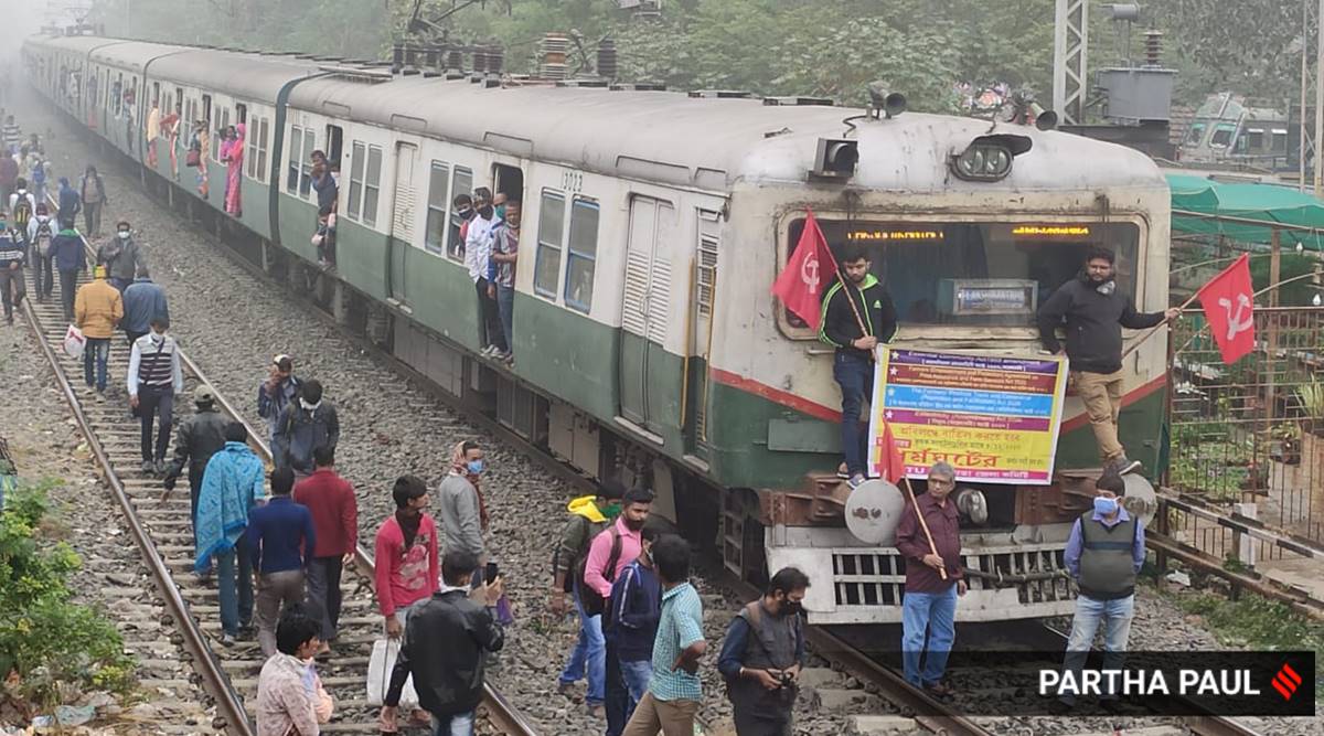 Railway service blocked by the Left supporters at Jadavpur Railways station during the nationwide strike called by farmers. (Express photo by Partha Paul)