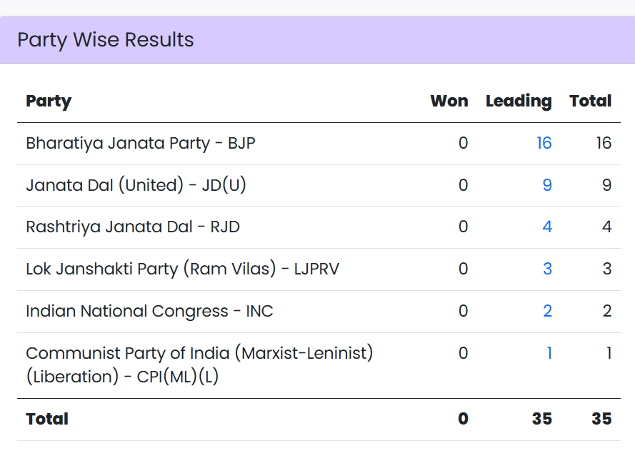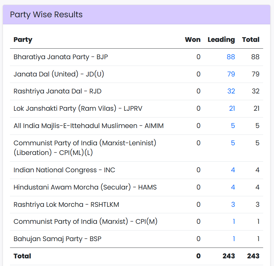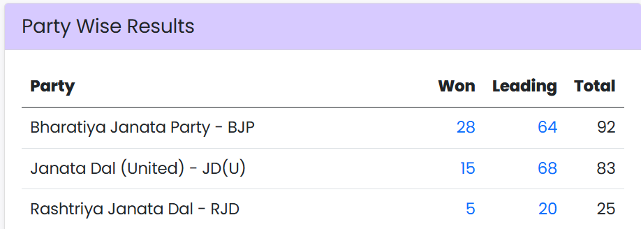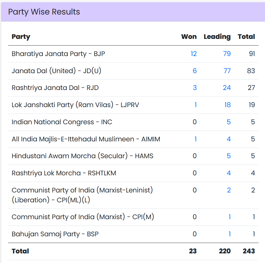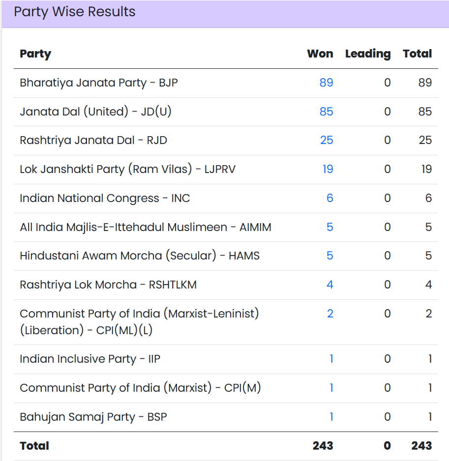 The NDA secured 46.52% of the vote, ahead of the Mahagathbandhan’s 37.64%. Within the ruling coalition, the BJP accounted for 20.08% of the vote, followed by the JD(U) with 19.26%, the LJP (RV) with 4.97%, HAM (S) with 1.18% and the RLM with 1.03%. In the Mahagathbandhan, the RJD finished with 23%, Congress with 8.71%, the Left parties with 4.18%, VIP with 1.38% and the IIP with 0.37%. The Congress narrowly avoided its lowest tally ever (4 seats in 2010); the RJD’s worst performance, too, was in 2010 (24 seats)