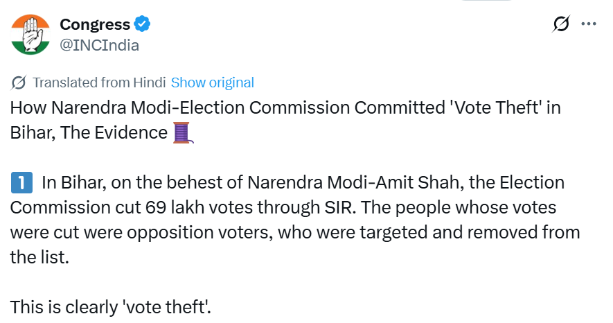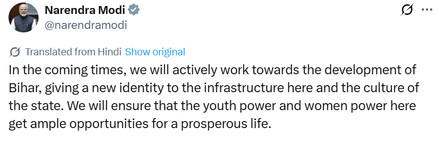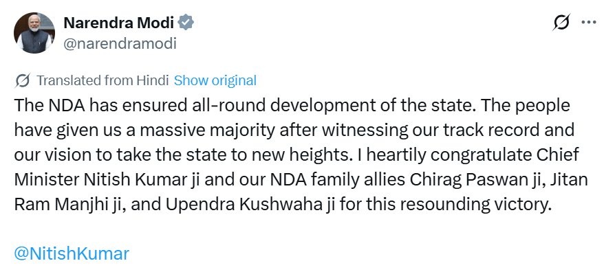 Prime Minister Narendra Modi arrived at the BJP Headquarters and addressed party workers after NDA’s landslide victory in the Bihar elections. During his address, PM Modi hailed NDA’s victory in Bihar and the development headed by Chief Minister Nitish Kumar, congratulating the citizens of the state for choosing ‘sushashan ki sarkar‘. Celebrating the NDA’s “prachand jeet” and invoking “Chhathi Maiya”, Prime Minister Narendra Modi told BJP workers in New Delhi that Bihar had voted for development and rejected the “communal MY formula” associated with the RJD’s Muslim-Yadav base and what he described as “jungle raj”. The Congress, however claimed that vote fraud was committed in Bihar by the ECI and the BJP. The BJP, on the other hand, has suspended three leaders a day after the results over “anti-party activities”.