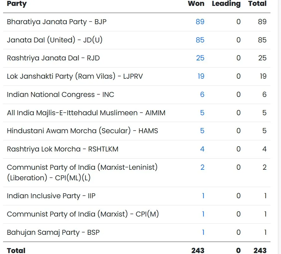 Bihar Elections LIVE Updates: JD(U) and BJP supporters wearing masks of Nitish Kumar and PM Narendra Modi celebrate the NDA's win; PM Modi in Delhi celebrates among NDA supporters (Photo: PTI/BJP).Bihar Election Results 2025 Live Updates: The NDA has emerged victorious in the Bihar assembly election with over 202 seats, securing a clear majority. The BJP bagged 89 seats, while Nitish Kumar-led JD(U) won 85 seats. Chirag Paswan’s LJP-RV won 19 seats. The Mahagathbandhan missed the halfway mark by a mile after securing just 35 seats. The RJD won 25 seats, while the the Congress party won 6 seats. With the Bihar election results clear now, the contest has turned out to be completely one-sided. Prashant Kishor’s Jan Suraaj Party, which claimed to be an alternative option for voters, has failed to get a look-in with 0 seats.