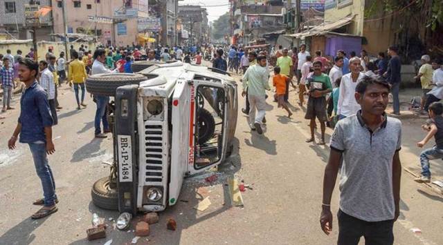 A police vehicle vandalised during a protest over the death of a police constable, in Patna, Friday, Nov 02, 2018. (PTI Photo)